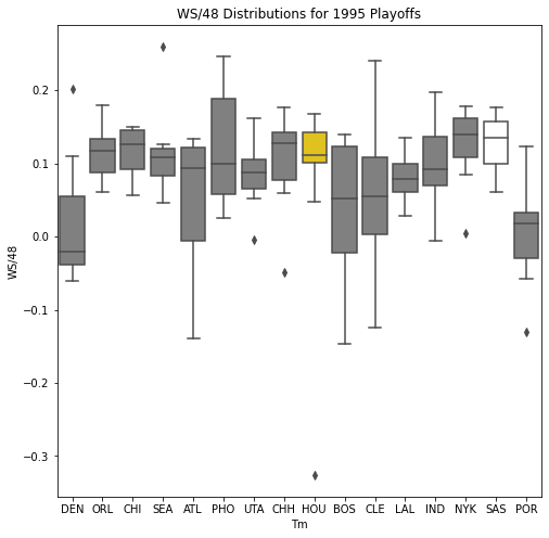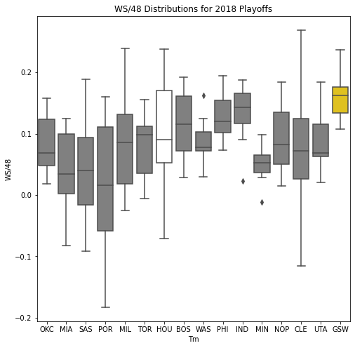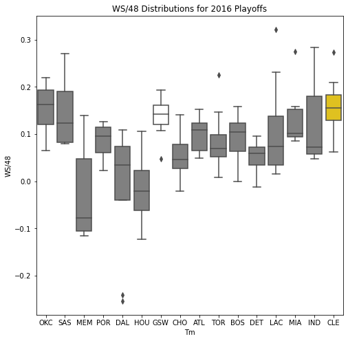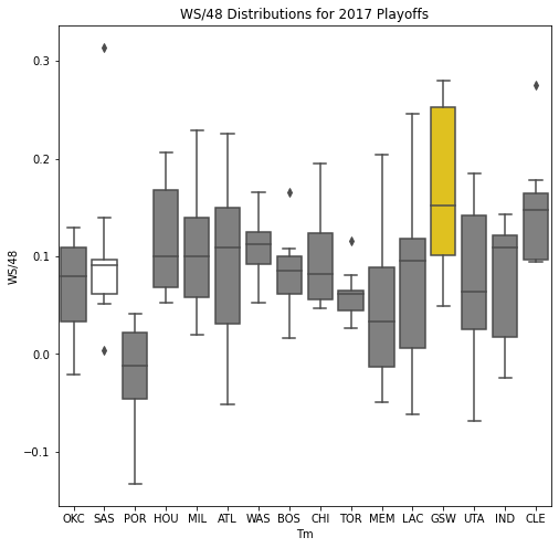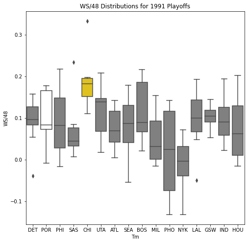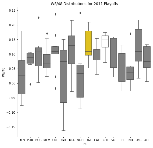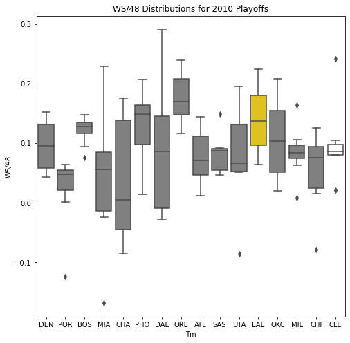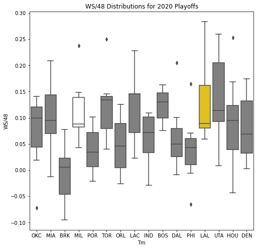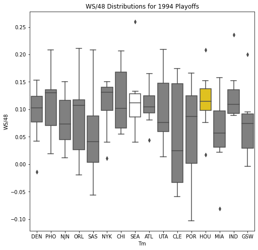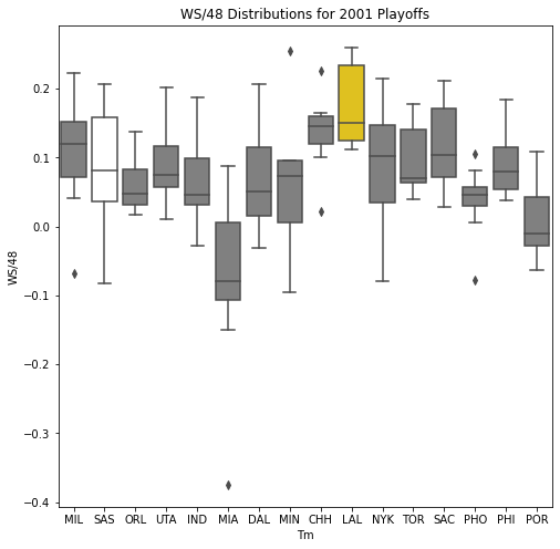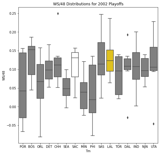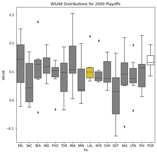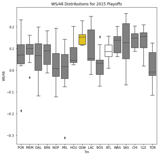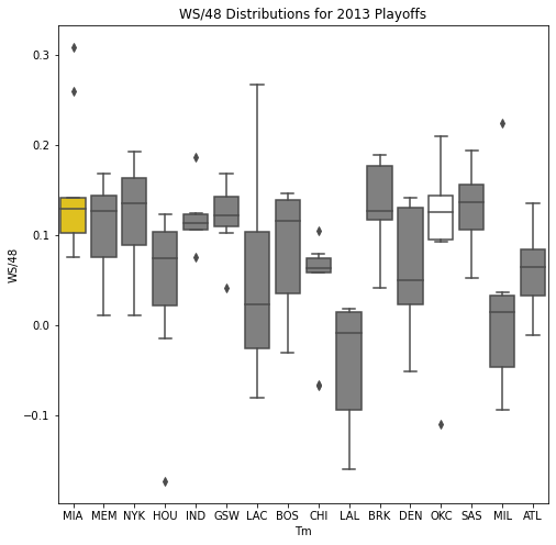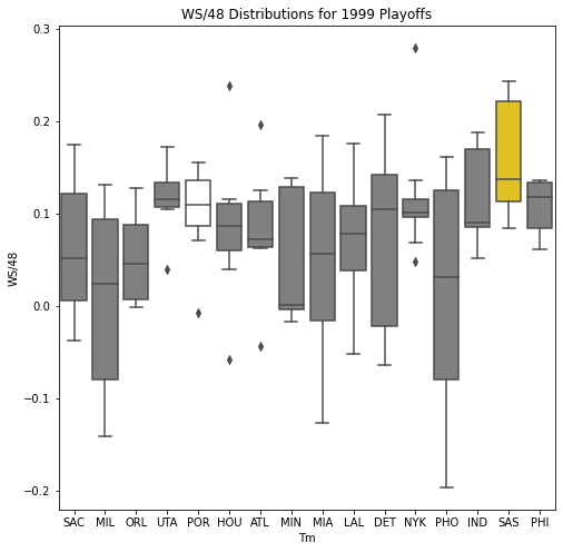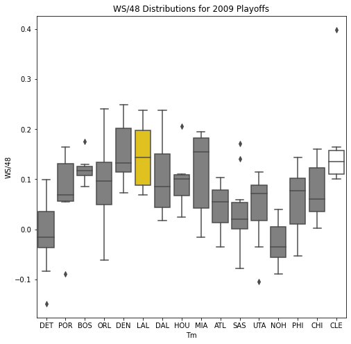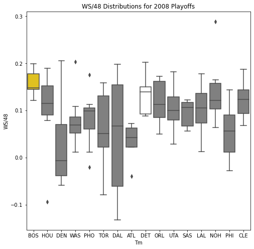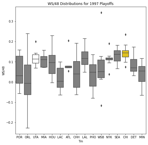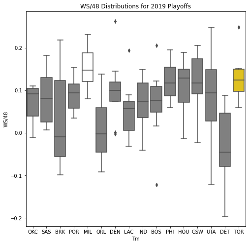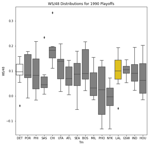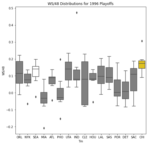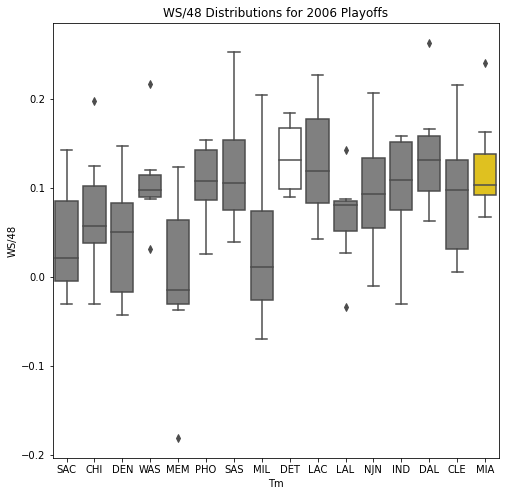Next, we will look at the WSD of all the teams during the playoffs. The first thing we notice about the box plots is that there are few outliers. In addition, only 10 of the past 30 champions had an outlier on the upper portion of the box plot. Another important pattern is that a high median win share often correlated with a championship. In 22 of the past 30 champions, the median win share was among the top 3 of all teams in the playoffs.
