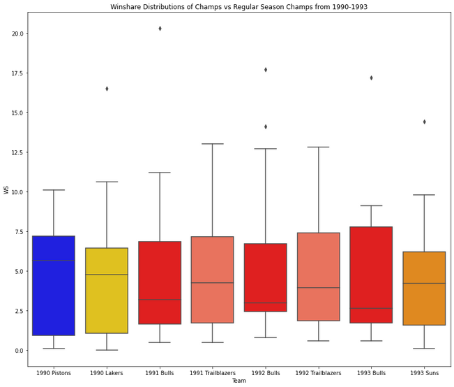 Above we have three different 4 year periods from each of the last 3 decades. For each group of two, the left side is the regular season winshare distribution of the NBA Championship winning teams, and on the right is that of the team with the worst regular record in the NBA. Each distribution takes the team’s top 12 winshare contributors. Looking at these distributions, it's clear that win shares are, at the very least, able to do a decent job at predicting a team’s number of wins. The boxplots for the championship winning teams were generally higher and more widespread. On the other hand, the teams with the worst records generally had lower box plots that were often more narrow. This makes sense, as teams with worse records should have fewer total win shares. We often see outliers for both championship winning teams and last place teams. However, the outliers on the championship winning teams are superstars, while those on last place teams are often just solid players.