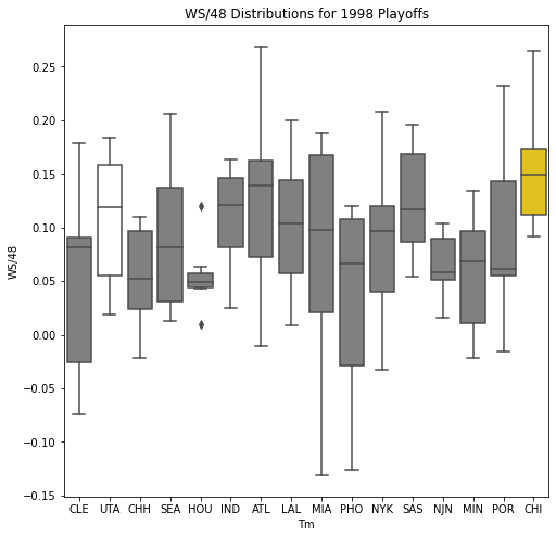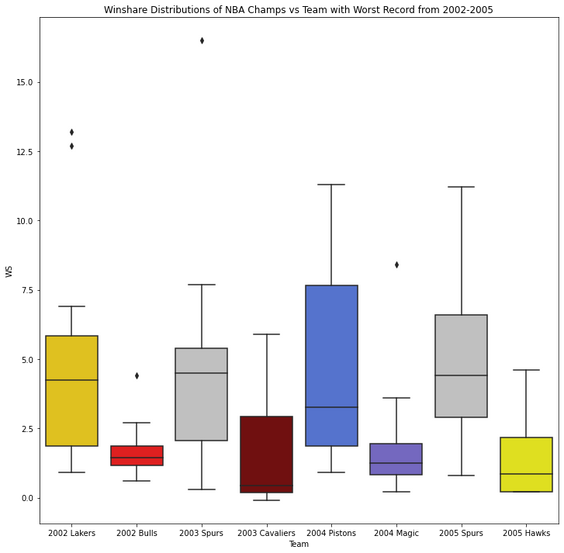 When analyzing the differences between the top teams and the worst teams, we do not want to focus on the significantly lower average win share that the worst teams. This is an obvious result, as the worst teams have the least wins. Rather, we want to analyze the distribution of win shares, which will allow us to compare the structure of each team. We find that the distribution of the top teams is much more spread out than that of the worst teams. In addition, we find outliers in many of the top teams but not in the bottom teams. These results signify that top teams must have at least one superstar, indicated by the outlier. In addition, they must have a couple other players supporting them. The players on the worst teams, on the other hand, contribute roughly the same amount to the team’s success. Even if these teams have an outlier, the rest of their team has extremely few win shares. While we often think that equal contribution by everyone on a team is beneficial, this is not the case in the worst teams in the NBA. The reason why this could be is that uniformity means there is no leader. Since no one is willing to step up and take charge, the team does not have someone to rely on during adversity. On the other hand, when we think of the best teams, one specific player comes to mind: the leader/ superstar. Michael Jordan, Kobe Bryant, Lebron James, etc. These are leaders that are able to unify their teammates and rally them during tough times to win a title.