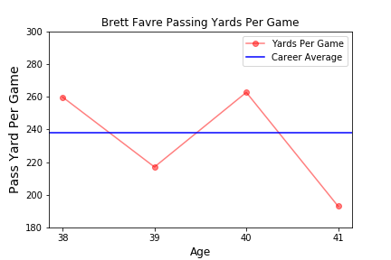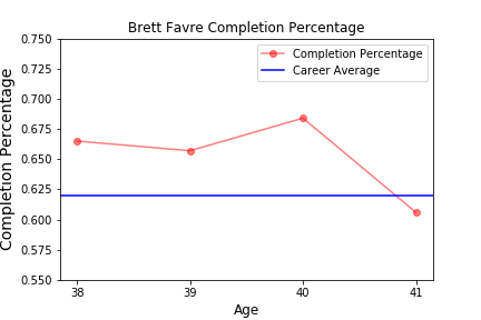 We can see that Favre, similar to Manning, had an uncharacteristically bad final season where he had a 60.6% completion percentage and an average of 193 pass yards per game. His career averages were 62% and 237.9 yards per game. Favre had a career year at age 40 posting the highest completion percentage (68.4%) and third-highest yards per game (262.6) of his career. However, he declined heavily in his final season. Favre also dealt with injuries in his final season suffering both foot problems and a sprained shoulder.