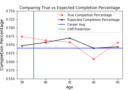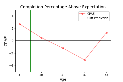 The Completion Percentage Above Expectation (CPAE) represents the difference between a quarterback’s true completion percentage and expected completion percentage, so the statistic represents how a quarterback compares to an average quarterback in terms of completion percentage. For Tom Brady, his CPAE after the cliff prediction declines pretty much linearly for 3 years, which backs up the idea that Tom Brady is essentially losing his touch. While Brady isn’t really falling off a cliff, he is at least sliding down a hill.
