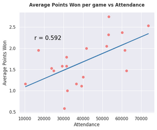 Next, we move on to analyzing how the number of fans attending a game influences the home performances of Premier League teams. Each data point in the scatter plots corresponds to 1 of the 20 teams, with its x-value representing the team’s average stadium attendance, and its y-value representing the team’s average per game of a particular performance metric. To illuminate the relationship between stadium attendance and the 4 performance metrics, we plotted linear regression lines that best fit the data points. The regression lines, along with their correlation coefficients, reveal a moderately positive relationship between stadium attendance and home team performance.Â