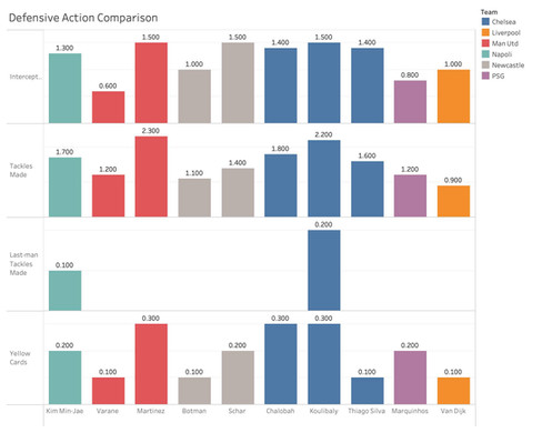 On the other hand, Chalobah contests about 3.6 aerial duels and 4.3 ground duels per game, with a success rate of 49.21% and 62.67% respectively. His number of attempts are on the middle of the scale, although his aerial duel success rate (49.21%) is the lowest on the list. Koulibaly contests in the last aerial duels among Chelsea’s defenders (3.1) with 54.10% win rate, but attempts the most on the ground (4.9) and wins 58.16% of them. In other words, he makes the second most ground duel attempts but has the second lowest success rate. An interesting statistic he has is that he made about 0.2 last-man tackles (tackle made in a situation where an attacking player is in possession, with only one opposing defender between the ball and the goal), and he is the only one on this list aside from Kim Min-Jae to have this data. He also has the most recoveries out of the Chelsea players, but loses possession second most frequently on the list.