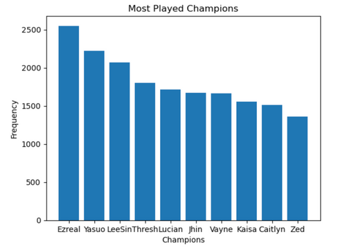 During the development of our recommendation model, we encountered a few challenges and limitations. One of the major issues was the significant imbalance in champion popularity among League of Legends players. For instance, champions like Ezreal, Yasuo, and Lee Sin were among the most frequently played champions, while other champions such as Skarner and Corki were rarely played. This imbalance posed a problem for our user-based collaborative filtering recommendation model as it could lead to an over-reliance on popular champions in our recommendations. To address this issue, we randomly downsampled the most frequently played champions to limit their occurrence in our dataset to 400 each, which is approximately the mean number of occurrences for champions. Additionally, we normalized the champion mastery points for popular champions by subtracting the mean mastery points value from each champion mastery point. By doing this, we hoped to ensure that our model would not simply recommend the most popular champions to every player, but instead provide a more diverse set of recommendations based on each player's preferences.