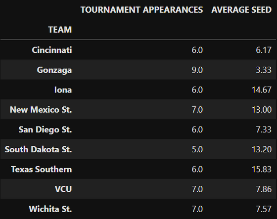 Though Gonzaga has not won a national championship in recent history, it has consistently been a national powerhouse despite coming from a mid-major conference. With a student body of under 8,000 students, Gonzaga puts the majority of its focus and resources into its basketball program. Coached by a future Hall of Fame coach in Mark Few, Gonzaga maintains its success through strong recruiting classes and veteran players. Only once in the last 9 tournaments has Gonzaga been a double digit seed, which we saw is very common for mid majors. Even then, Gonzaga made it to the Sweet Sixteen that year.