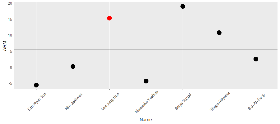 In these plots, we graphed a horizontal intercept that represents the average value for each players’ values. We notice that in the plot below, Lee Jung Hoo ranked third in the wOBA and first in BABIP. Lee Jung Hoo has a strong ability to hit the ball and his wOBA is extremely promising considering that he is much younger than Seiya Suzuki and Masataka Yoshida when they entered the MLB.