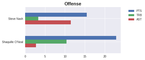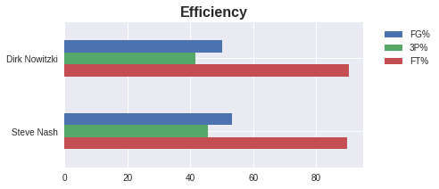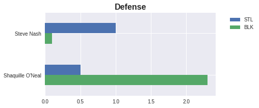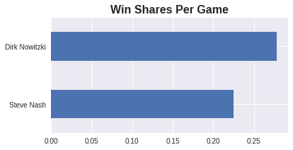Nowitzki's 24.6 points per game exceeded Nash's 18.6. His rebounding (8.9 per game) was excellent, while Nash displayed his offensive mastery through his league-leading 11.6 assists. Neither player was a monster defensively, but Nowitzki almost averaged a block per game and was close to Nash's steal rate of almost one per game. Finally, Nowitzki established a solid win shares cushion over Nash.