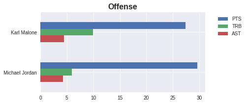 MJ's 29.6 points per game narrowly outdid Malone's 27.4, while Malone displayed a strong command inside with rebounding. Assists, steals, and blocks were virtually equal. Malone's field goal percentage of 55% was substantially higher than MJ's 48.6%, presumably due to closer shot selection. Jordan showed greater mastery from distance at 37.4% from 3 and 83.3% from the free throw line. Finally, Jordan also showed a slight edge in win shares per game.