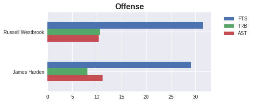 Westbrook led the league in scoring with 31.6 points per game, while Harden was close behind at 29.1. Harden had a league-high 11.2 assists per game with Westbrook at 10.4. Westbrook was a slightly better rebounder with 10.7 per game. Harden held very slim edges in efficiency across the board, at 44.0%, 34.7%, and 84.7% for field goals, 3s, and free throws respectively. The players had nearly equivalent defensive stats, about 1.5 steals and 0.5 blocks per game. Harden contributed slightly more win shares than Westbrook as a result of the win disparity between Houston and OKC.