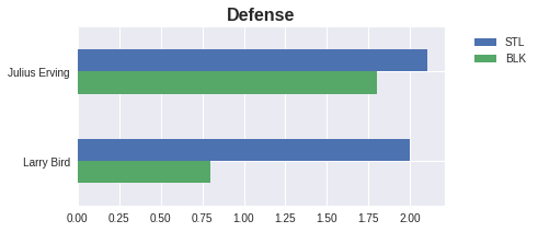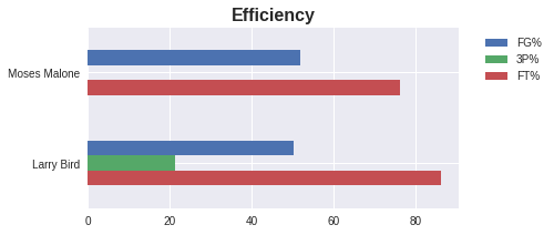 Malone was 2nd in the league in scoring with 31.1 points per game, far outpacing Bird's 22.9 yet most likely due to the Celtics' superior players sharing the scoring load. Bird picked up an impressive 10.9 rebounds per game but Malone was better with 14.7. Bird was a more effective playmaker with 5.8 assists per game. He also had more steals with 1.9 per game while Malone was forceful inside with 1.5 blocks per game. In terms of efficiency, both players were around the 50% mark for field goal percentage. It is no graphing error though that Malone ended up 0% from 3; this statistic serves as a bracing reminder of just how different today's era and requisite qualifications of MVP-caliber players are. Bird meanwhile shot better from the free throw line at 86.3% and actually converted his 3-point attempts - albeit at only 21.2%. In terms of win shares, Malone displayed a small advantage.