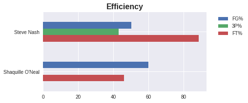 Shaq outscored Nash by a wide margin, 22.9 to 15.5 points per game. He also was a dominating force on the glass with 10.4 rebounds per game. Nash demonstrated his central role in the team's success with a league-leading 11.5 assists per game. In terms of efficiency, there's a reason Hack-a-Shaq became a popular if inconsistently effective strategy in the league. While O'Neal converted a spectacular 60.1% of his field goals, he was a woeful 0% from 3 and 46.1% from the line. Nash was 50.2%, 43.1% and 88.7%, narrowly missing out on his first 50/40/90 season. On defense, Shaq wreaked havoc with 2.3 blocks per game while Nash could be disruptive with 1.0 steal per game. With regard to win shares, both players were about tied.