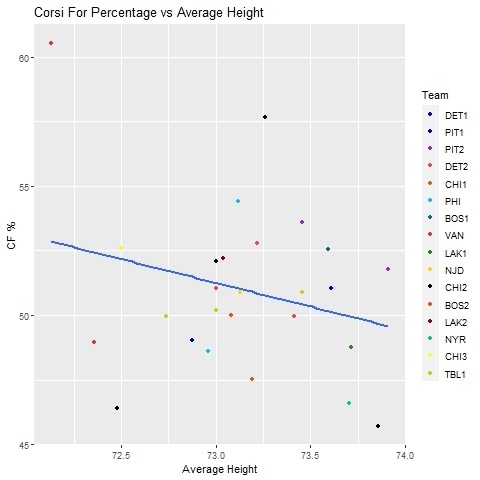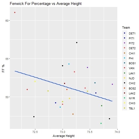 We have here scatterplots of CF% and FF% plotted against the average height of each team from the previous bar graph with an overlaid best-fit line to show the trend. The trendline is a bit misleading, as it is heavily influenced by the 2007-08 Detroit Red Wings. Looking at the rest of the points suggests there really is no linear relationship between CF% and FF% with average height as all of the points are scattered without a discernable pattern. So it is possible that a team’s size has little to no impact on their success in the playoffs depending on how skilled the team is.