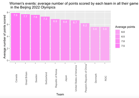 For our analysis, we selected curling data from the most recent Olympic Games, which was the Beijing 2022 Winter Olympics. First, we sought to identify which teams scored the greatest total number of points (from all games) and the greatest average number of points per game.