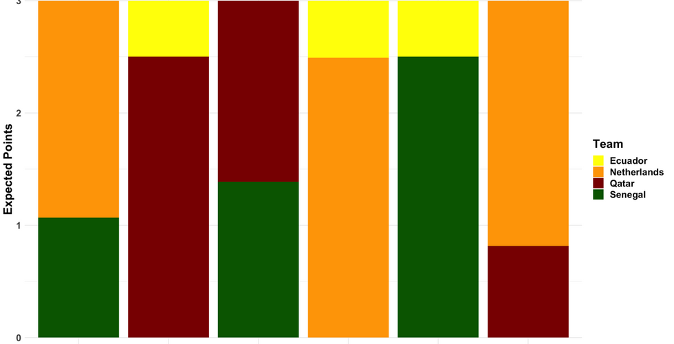We implemented this formula in R to run 10,000 simulations of each group stage match, and calculated the simple mean of the number of points won by each team. Data visualizations were created using the ggplot2 package, and the point totals displayed in the tables were rounded to five significant figures. The results are as follows: